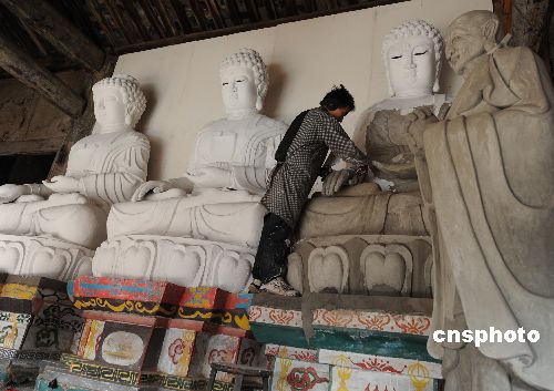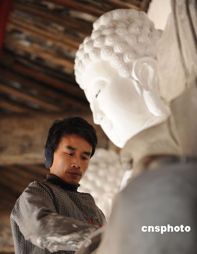 在四川大地震中受到損壞的北川縣古建筑黃恩寺,泥塑工匠新年伊始精心修復(fù)主殿三圣佛像。這座明末清初始建后歷代維護(hù)的古建筑,地處今春將開(kāi)工的北川縣城新址中心位置。中新社發(fā) 賈國(guó)榮 攝