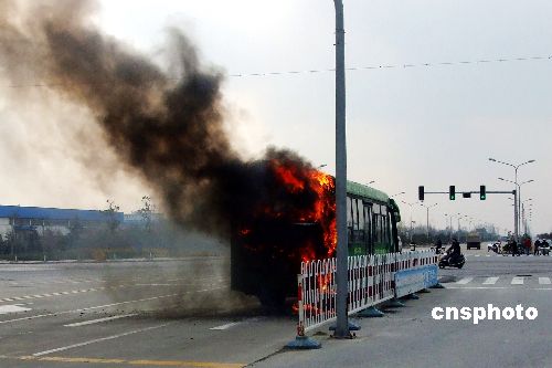 2009年1月9日下午兩時,江蘇鹽城市區(qū)一20路公交車行駛到鹽瀆路與西環(huán)路交界處發(fā)生自燃,當(dāng)時車內(nèi)有七八名乘客,由于疏散及時,并沒有造成人員傷亡,火也被消防人員及時撲滅,車輛卻受損嚴(yán)重,公交部門初步斷定起火原因是電路故障。中新社發(fā) 李根 攝