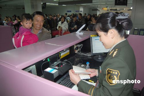 一月十一日,春運(yùn)首日,福州長(zhǎng)樂(lè)國(guó)際機(jī)場(chǎng)迎來(lái)旅客入境高峰,入境旅客較平日大幅增長(zhǎng)。針對(duì)春運(yùn)旅客入境高峰,福州機(jī)場(chǎng)邊檢站調(diào)整現(xiàn)場(chǎng)執(zhí)勤警力,開(kāi)足通道,加強(qiáng)引導(dǎo),全力保障旅客快速通關(guān)。中新社發(fā) 龍景定 攝