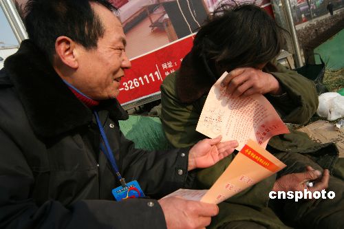 1月22日,許昌市救助管理站的工作人員在救助一個(gè)生活無(wú)著人員。春節(jié)即將到來(lái),為更好地向困難群體獻(xiàn)愛(ài)心、送溫暖,不讓一個(gè)生活無(wú)著人員流落街頭,當(dāng)日,河南省許昌市救助管理站開(kāi)展“迎新春社會(huì)關(guān)愛(ài)生活無(wú)著人員”活動(dòng),對(duì)符合救助條件的求助者,無(wú)償提供食宿、幫助聯(lián)系親屬等。這次活動(dòng)除與各區(qū)縣救助站同時(shí)開(kāi)展宣傳、咨詢(xún)活動(dòng)外,還會(huì)派流動(dòng)小分隊(duì)走上街頭,對(duì)生活無(wú)著人員進(jìn)行勸導(dǎo),實(shí)施現(xiàn)場(chǎng)救助。中新社發(fā) 牛書(shū)培 攝