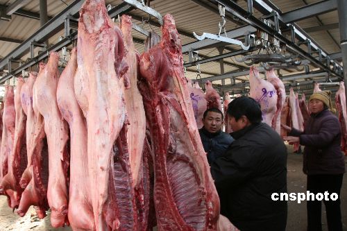 1月22日下午,河南省開封市南郊一生豬定點屠宰廠里人們正在批發(fā)豬肉。春節(jié)將至,開封市豬肉市場生意日益紅火。有關部門加大市場監(jiān)管力度,堅決杜絕經(jīng)營私屠濫宰肉、注水肉、超期變質(zhì)肉、假冒品牌肉、缺少證照等違法現(xiàn)象,讓人民群眾吃上“放心肉”。中新社發(fā) 凱楓 攝