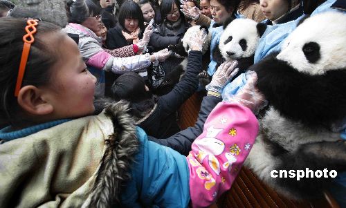 1月17日,中國農歷大年初二,來自都江堰的十七名因汶川大地震新增的“三孤”人員,受邀來到成都大熊貓繁育研究基地:參觀大熊貓產房、品嘗大熊貓專用“窩頭”、和大熊貓親密接觸合影留念……度過了一個獨具意義的春節(jié)。圖為孩子們與大熊貓親密接觸。中新社發(fā) 張全能 攝