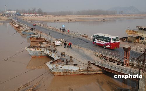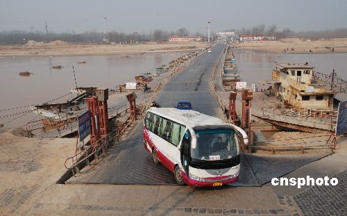 2009年1月29日,車輛從剛恢復通車的濼口浮橋上通過。由于近期氣溫回升,黃河濟南段流凌密度降至10%以下,截至上午8時,濼口段流量保持在248立方米/秒以下,持續(xù)一個多月的凌汛已經(jīng)大幅度緩解。據(jù)濟南黃河防汛辦公室專家稱,近期黃河下游不會形成嚴重凌汛。濼口浮橋下游的章丘、歷程、濟陽有10段封河,封河長度在25公里左右。中新社發(fā) 滕越 攝