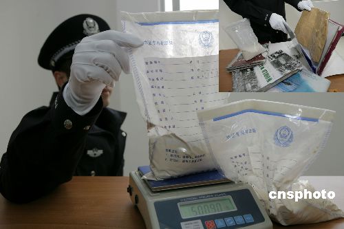二月三日,福州海關(guān)緝私警察展示新繳獲的毒品海洛因。連日來,福州海關(guān)駐長樂機(jī)場辦事處旅檢關(guān)員在對吉隆坡-廣州-福州航班進(jìn)行監(jiān)管時(shí),連續(xù)查獲三起東南亞籍旅客涉嫌走私毒品入境案件,共繳獲毒品海洛因凈重四千六百七十七點(diǎn)六克,抓獲犯罪嫌疑人三名。中新社發(fā) 陳多 攝