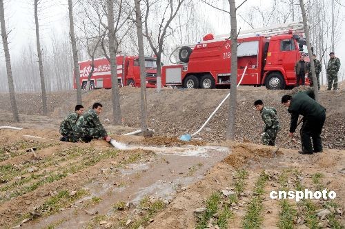 2月6日,河南省濮陽市公安消防支隊官兵把消防車輛開進(jìn)高新區(qū)皇甫路辦事處后皇甫村田間地頭,為貧困家庭澆灌麥田。去年冬季以來,濮陽市降雨稀少,旱情十分嚴(yán)重。在抓好執(zhí)勤備戰(zhàn)的同時,濮陽消防官兵積極參與抗旱澆麥,受到群眾的歡迎。中新社發(fā) 劉敬寬 攝