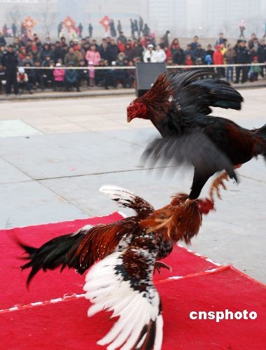 2月7日,元宵節(jié)臨近,斗雞大賽在青島鳳凰島民間藝術(shù)節(jié)舉行,這一流行于古代宮廷的娛樂活動(dòng)走進(jìn)民間,引來了眾多市民觀看。中新社發(fā) 俞方平 攝