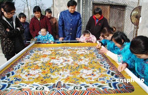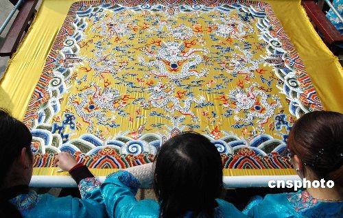 2009年2月10日,一幅長117.5厘米、寬132厘米,使用了18萬顆直徑1.3毫米珍珠“繡”制的《織繡串珍珠九龍皇墊》在蘇州高新區(qū)東渚鎮(zhèn)繡制完成。此作品由4個繡娘費(fèi)時7個月制作完成,在1.5米乘1.5米的手工云錦底布上,共使用了純金線3000米,真絲花線2000克和18萬顆珍珠。中新社發(fā) 朱子寒 攝