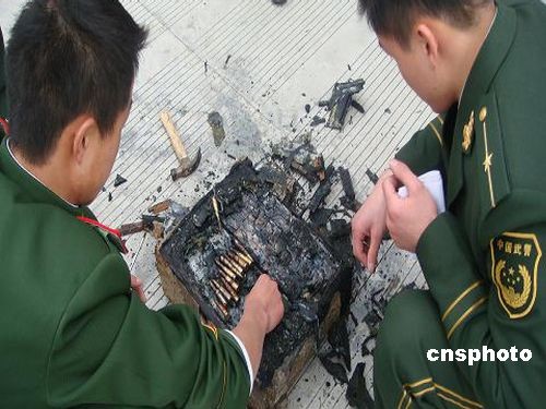 2月11日,浙江省蒼南縣炎亭邊防派出所民警下鄉(xiāng)走訪時(shí),遇見(jiàn)漁民陳某正在家門(mén)口用榔頭敲打一個(gè)表面裹滿了泥沙的木箱子,打開(kāi)后發(fā)現(xiàn)有1000余發(fā)軍用子彈。據(jù)邊防民警介紹,這箱子彈保存較為完好,大約戰(zhàn)爭(zhēng)年代遺留下來(lái),是漁民陳某在2月10日出海作業(yè)時(shí)從海底打撈上來(lái)的,誤當(dāng)作稀有“古董”運(yùn)回家中收藏。目前,警方已依法對(duì)這箱子彈進(jìn)行了收繳。中新社發(fā) 吳水斌 攝