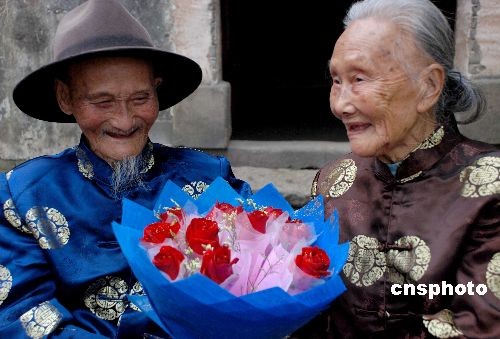 2月14日,江西樂(lè)平市禮林鎮(zhèn)黃家村102歲老人黃德勝與96歲老伴程銀枝手捧該市民政局、老齡委工作人員贈(zèng)送來(lái)的玫瑰花,臉上露出喜悅之情。當(dāng)日是“情人節(jié)”,樂(lè)平市民政局、老齡委聯(lián)合開(kāi)展了“玫瑰花贈(zèng)送百歲老人”活動(dòng),把玫瑰鮮花、奶粉、桃酥等慰問(wèn)品贈(zèng)送到該市6位百歲老人手中,以祝福他們晚年幸福、健康長(zhǎng)壽。中新社發(fā) 朱定文 攝