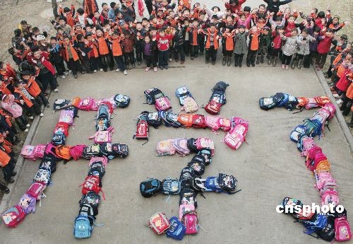2月15日,外來務(wù)工人員子女專門學(xué)!綎|臨沂商城實(shí)驗(yàn)學(xué)校的小學(xué)生用五顏六色的書包擺出“ 開學(xué)了”的字樣造型,歡呼慶祝新學(xué)期開學(xué)。中新社發(fā) 王立勝 攝