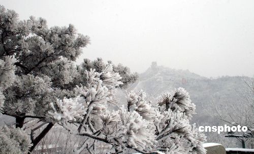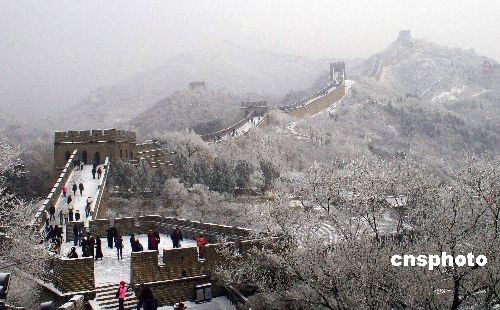 2月18日,雨水節(jié)氣。一場春雪將八達(dá)嶺長城裝扮得格外壯觀。圖為銀裝素裹的八達(dá)嶺長城。中新社發(fā) 張民 攝