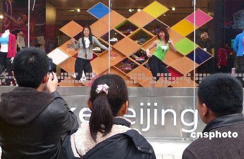 2009年2月21日,北京王府井某商場,兩位模特在櫥窗內激情表演動感十足的舞蹈,以此吸引過往行人的目光,為商場增添人氣。中新社發(fā) 玉龍 攝