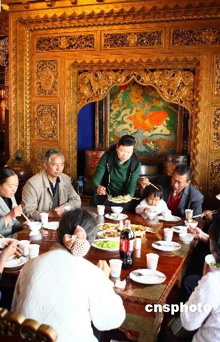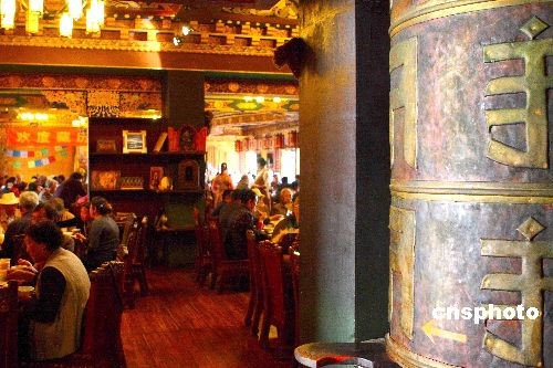 隨著在昆明定居的藏族民眾越來越多,獨具特色的藏族飲食也越來越受到昆明市民的喜愛,酥油茶、青稞酒和牦牛肉這些來自藏區(qū)的綠色食品更是受到熱捧。圖為藏歷新年期間,昆明最有名的“瑪吉阿米香格里拉風情宮”藏式餐廳人滿為患,昆明市民紛紛到此感受藏歷新年的別樣風情。中新社發(fā) 劉冉陽 攝
