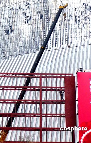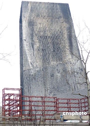 2009年2月26日,北京中央電視臺新址火災(zāi)北配樓旁,工人正在搭建腳手架和圍擋,準備拆卸被燒毀的外殼進行修復,預計今年內(nèi)完工。中新社發(fā) 玉龍 攝