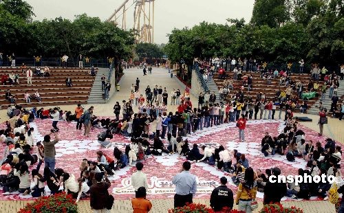 三月一日,為慶!叭恕眿D女節(jié)的即將到來,三百多名女士齊聚廣州長隆歡樂世界挑戰(zhàn)“人肉多米諾”骨牌。圖為蝴蝶形狀的骨牌圖案逐漸散開,場面壯觀。中新社發(fā) 劉衛(wèi)勇 攝