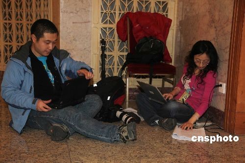 3月5日,十一屆全國(guó)人大二次會(huì)議在北京人民大會(huì)堂開幕。圖為在大會(huì)堂走廊上,采訪大會(huì)的記者席地而坐,爭(zhēng)取以最快的速度傳送稿件。中新社發(fā) 張婭子 攝