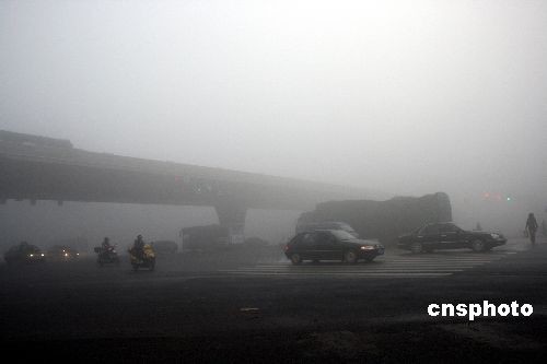 3月9日,湖南長沙出現(xiàn)大霧,局部地段能見度不足20米。圖為長沙大道與萬家麗路交匯處,車輛行人小心翼翼通行。中新社發(fā) 卓新民 攝