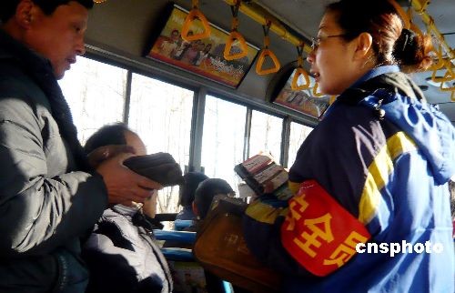 3月9日,為確保正在北京召開的人大、政協(xié)“兩會”治安安全,北京公交車上的司售人員加強了安全防范。中新社發(fā) 錢興強 攝