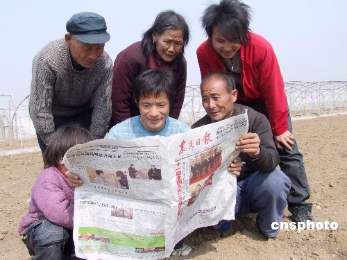 3月9日,山東省棗莊市山亭區(qū)店子鎮(zhèn)返鄉(xiāng)農(nóng)民工張士軍(右二)在農(nóng)活空閑時間和村民們一起在地頭學(xué)習溫家寶總理作的《政府工作報告》。連日來,棗莊市山亭區(qū)人民通過電視、電腦、報紙等媒體搜索溫家寶總理作的《政府工作報告》,在山亭區(qū)形成一種學(xué)習熱。中新社發(fā) 王啟蒙 攝