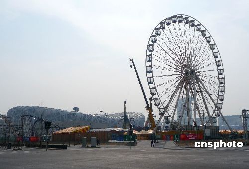 2009年3月10日,在北京奧林匹克公園“鳥巢”東北角,摩天輪、海盜船、太陽神車等在內(nèi)的娛樂設(shè)施已經(jīng)搭建完畢,目前正在加緊調(diào)試中,預(yù)計(jì)將于本月中旬開業(yè)迎客。據(jù)悉,此次嘉年華不同于前幾年舉辦的環(huán)球嘉年華活動(dòng),包括包括海盜船等在內(nèi)的40個(gè)機(jī)動(dòng)游樂項(xiàng)目和56個(gè)競技游樂項(xiàng)目會(huì)給游客耳目一新的感覺,而且隨著季節(jié)的更替和游客喜愛程度的不同,這些大型游樂設(shè)施會(huì)定期替換。中新社發(fā) 玉龍 攝