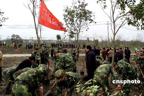 3月11日上午,植樹(shù)節(jié)即將到來(lái)之際, 江蘇省揚(yáng)州市開(kāi)展全民義務(wù)植樹(shù)活動(dòng)。江蘇某預(yù)備役高炮師組織官兵到駐地參加義務(wù)植樹(shù)。圖為官兵在同當(dāng)?shù)厥忻窆餐N下白玉蘭樹(shù)。中新社發(fā) 田亞威 攝