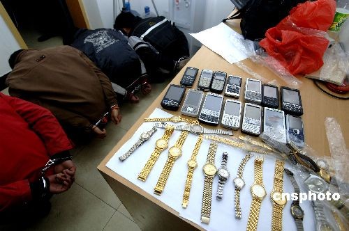 三月十二日,一伙盜竊分子在福州臺(tái)江刑偵大隊(duì)背對(duì)贓物,準(zhǔn)備接受審問(wèn)。福州警方近日破獲一起盜竊團(tuán)伙案,八名四川籍犯罪嫌疑人因撬開(kāi)沿街商鋪盜竊名表、手機(jī)、電腦等貴重物品被捕。中新社發(fā) 王東明 攝