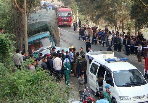 3月12日早上,廣西百色市田林縣境內(nèi)一輛奇瑞QQ小汽車在彎道處超車時,不慎撞上迎面而來的一輛貴州籍大貨車,造成QQ車上兩人一死一傷。中新社發(fā) 唐廣斌 攝