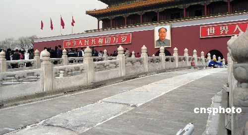 背景資料:為迎接新中國成立60周年,天安門管委會從2009年2月18日起對金水橋?qū)嵤┍Wo修繕,工程擬于2009年5月1日前完工,并整體對外開放。 中新社發(fā) 玉龍 攝