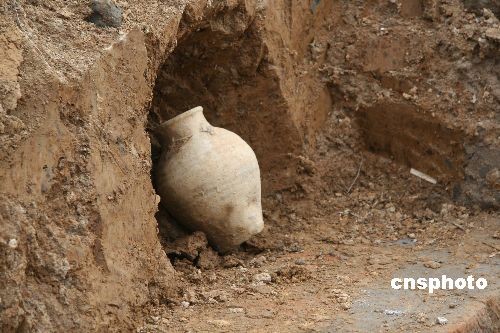 3月16日,施工人員在正在興建的安徽巢湖北外環(huán)施工工地發(fā)現(xiàn)兩座古墓。發(fā)掘的兩座古墓被確證為東漢晚期墓,其中一古墓葬為土坑墓,另一座為磚坑墓。據(jù)該市文管所同志介紹,這兩座漢墓均被盜過,而且被盜一空,在發(fā)掘時(shí),發(fā)現(xiàn)盜墓賊留下一個(gè)很大的盜洞,直通墓中央。從盜墓賊盜墓的舉動(dòng)和第二座漢墓墓磚結(jié)構(gòu)及墓磚上的花紋判斷,此墓墓主應(yīng)該有些身份,多少有些隨葬品,然而,發(fā)掘人員除了發(fā)掘出一些瓦罐的碎片,挖出惟一一只完整的陶罐。此只陶罐不是在墓坑挖出的,而是在墓坑外二十公分處。據(jù)文管所同志分析,此罐可能是后人祭祀留下的,或是盜墓賊丟下的。中新社發(fā) 李遠(yuǎn)波 攝