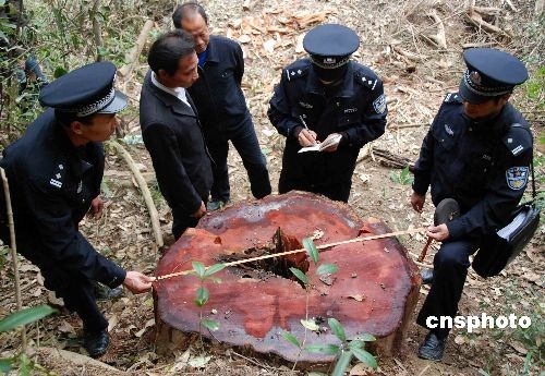 3月20日,江西省婺源縣森林公安局民警在案發(fā)現(xiàn)場對砍伐后的紅豆杉進(jìn)行偵察。紅豆杉是國家一級重點(diǎn)保護(hù)野生植物。經(jīng)鑒定,被盜的一株蔸部直徑為1.07米,活立木蓄積7.494立方米,樹齡為670年以上;另一株蔸部直徑為0.88米,活立木蓄積4.310立方米,樹齡為550年以上,總蓄積量達(dá)11.804立方米。目前,紅豆杉已經(jīng)全部追回,14名犯罪嫌疑人員全部到案歸捕,目前此案正在進(jìn)一步審理當(dāng)中。 中新社發(fā) 王國紅 攝