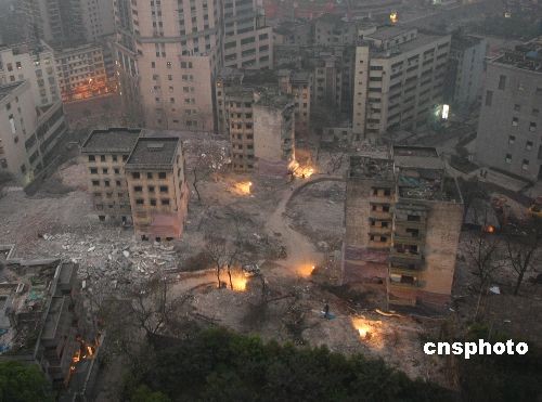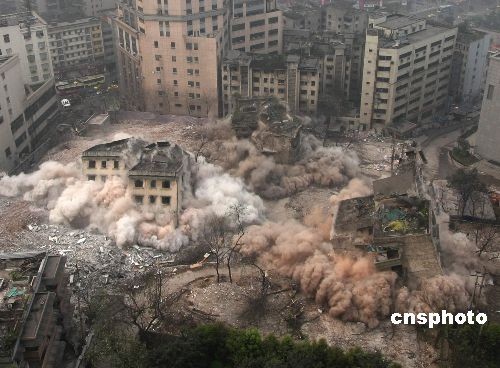 2009年3月21日,重慶江北區(qū)觀音橋處成功進行了危舊房定向爆破。當日早晨8時,一聲巨響,當?shù)赜灞倍宥柕貕K的6棟樓房被爆破拆除,總面積1000平方米。這是重慶2009年危舊房改造的第一爆,是觀音橋商圈快速推進“長江上游商貿(mào)中心”的重要舉措。中新社發(fā) 賀終榮 攝
