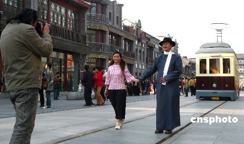 3月23日,在北京前門大街,一對年輕情侶身穿舊時中式服裝留影,吸引了過往行人的目光。 中新社發(fā) 玉龍 攝