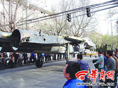 昨日(24日)下午5時許,一架被卸掉雙翼、沒有機(jī)頭的戰(zhàn)機(jī),被一輛卡車拖著從西安火車東站拉出來,引起好奇市民的圍觀。飛機(jī)途經(jīng)路段,圍觀人群擠滿了馬路。
