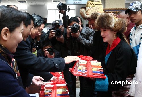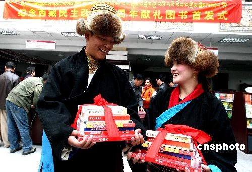 3月25日,紀(jì)念西藏民主改革50周年獻(xiàn)禮圖書首發(fā)式在拉薩舉行。藏漢文版大型畫冊(cè)《西藏今昔》、全彩版圖書《雪域邊線行》、藏文版《西藏民主改革50年》等圖書在具有歷史重大意義的時(shí)候?yàn)樽x者獻(xiàn)上一份厚禮。中新社發(fā) 杜洋 攝