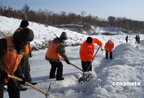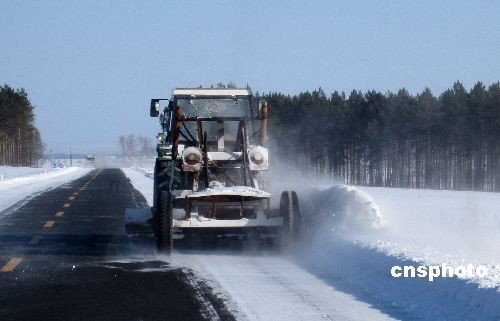 3月25日,黑河市公路管理站的大型機(jī)械在國道清理冰雪。連日來,黑河市普降大雪,黑河市公路管理站立即啟動應(yīng)急預(yù)案,緊急組織機(jī)械、人力、配合道班員工不分晝夜地清理路面積雪和冰湖。中新社發(fā) 邱齊龍 攝