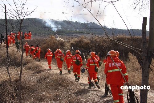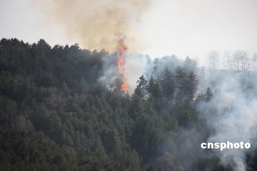 2009年3月28日下午2時左右,山西省盂縣東梁鄉(xiāng)東梁村騎龍山發(fā)生森林火災(zāi)。 森林火災(zāi)發(fā)生后,當(dāng)?shù)卣、公安、林業(yè)、醫(yī)務(wù)等部門第一時間趕到現(xiàn)場,組織滅火,并啟動了相關(guān)應(yīng)急預(yù)案。當(dāng)?shù)爻鰟訑?shù)百名干部群眾撲火,陽泉市武警也趕赴現(xiàn)場增援。由于火勢兇猛,在附近的村莊都能聽到火燒山林的聲音,山火的灰塵甚至飄到了最近的溫家山村。截至發(fā)稿時,沒有人員傷亡報告。中新社發(fā) 程瑜 攝