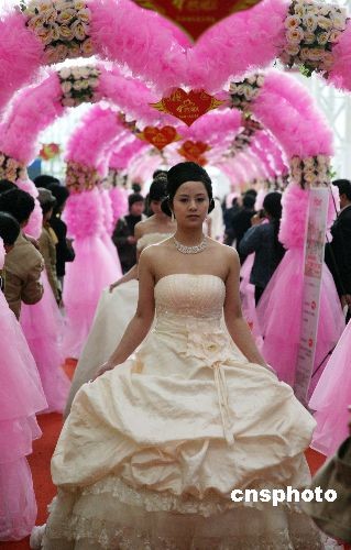 3月29日,在南京國(guó)際展覽中心舉辦的2009南京首屆婚慶文化博覽會(huì)上,組委會(huì)特意制作了一座2009分米長(zhǎng)的婚慶彩門(mén),這座婚慶彩門(mén)由60個(gè)彩色拱門(mén)組成,每15個(gè)彩色拱門(mén)為一種主色調(diào)。據(jù)介紹,這座婚慶彩門(mén)是世界上最長(zhǎng)的婚慶彩門(mén)。中新社發(fā) 鐘山 攝