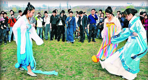 3月29日,農(nóng)歷三月三上巳節(jié),是中國傳統(tǒng)的“女兒節(jié)”。西安一群愛好漢服的女子來到唐城墻遺址公園的吟詩壇里秀風(fēng)采。幾個(gè)女孩子以古代名畫《女史箴圖》為藍(lán)本,以情景劇形式表現(xiàn)中國古代貴婦的妝容文化。旁邊還配有專業(yè)人士指導(dǎo)并現(xiàn)場(chǎng)解說,向大家介紹中國古代婦女的妝容。隨后,她們又到曲江池遺址公園湖邊,舉行祓禊祈福活動(dòng),并踢起了球。