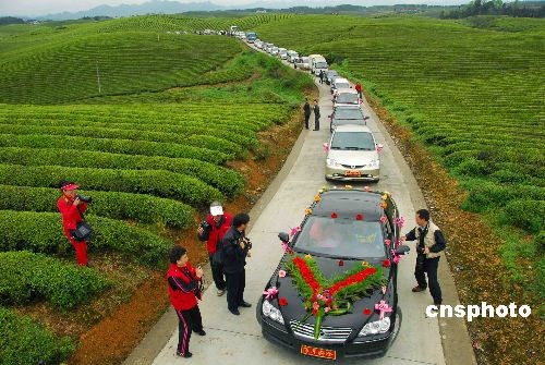 2009年3月28日,在貴州省湄潭縣生態(tài)萬畝茶場,一對當(dāng)?shù)匦氯伺e行隆重的婚禮,浩浩蕩蕩的迎親隊(duì)伍在蔥綠的茶園中格外醒目,給豐收的茶鄉(xiāng)帶來無限生機(jī)。改革開放以來,國家出臺的一系列政策,給現(xiàn)在的農(nóng)村帶來了新氣象,讓農(nóng)村人得到了實(shí)惠,生活更加富裕。中新社發(fā) 張?zhí)炝?攝