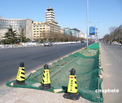 2009年4月1日,北京長安街復(fù)興門南側(cè)路段機(jī)動(dòng)車道和非機(jī)動(dòng)車道之間的綠化帶已拆除,為了防止揚(yáng)塵現(xiàn)象的產(chǎn)生,原綠化帶的地面上全都鋪設(shè)了各色遮擋物。民族文化宮南側(cè)的施工人員正在加緊遷移路邊的樹木,這些都標(biāo)志著長安街拓寬工程開始進(jìn)入實(shí)施性進(jìn)展階段。 中新社發(fā) 玉龍 攝