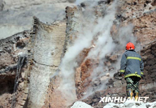 目前,救援工作仍在進(jìn)行中。由于石灰窯窯口前的臺地面積很小,且有一條大裂縫,消防車一時難以駛?cè);消防人員用高壓水槍作業(yè)時,水一噴上去窯體即不斷塌方,救援難度較大。