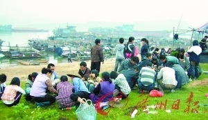 昨天下午4時許,記者在現(xiàn)場看到,300多名三水大塘的漁民聚集在北江邊。此后,村民登上已等候在北江邊的大船,乘船過江前往江河對面的大坑山墓群,那里就是林姓家族祖先墓穴之處。祭拜持續(xù)40分鐘左右結(jié)束,隨后村民乘船過江返回。