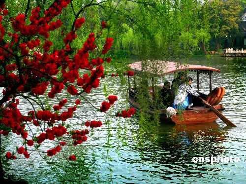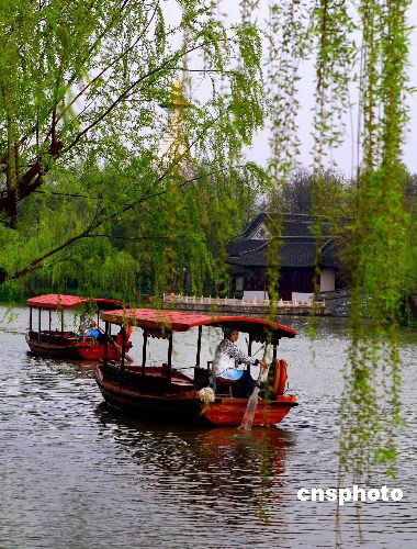 4月8日,揚(yáng)州著名的風(fēng)光旅游區(qū)花紅柳綠,春意盎然。當(dāng)?shù)芈糜尾块T(mén)新招募的一批大學(xué)生“船娘”正在瘦西湖上帶著游客欣賞春光。揚(yáng)州大學(xué)生當(dāng)“船娘”就業(yè)前曾引起新聞媒體界關(guān)注,如今大學(xué)生們接受培訓(xùn)后相繼上崗,成為新的靚麗風(fēng)景。中新社發(fā) 宋吉河 攝