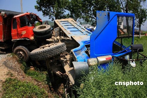 2009年4月17日11時(shí)許,在安徽休寧慈張線川湖路段發(fā)生一起嚴(yán)重車禍。一輛裝滿石子的大貨車在左拐彎時(shí)與迎面而來(lái)的一輛貨車發(fā)生了嚴(yán)重相撞,裝滿石子的大貨車被撞入2多米深的油菜田,兩車身嚴(yán)重受損,駕駛室被撞得不堪入目,兩名駕駛員受傷嚴(yán)重,被送往就近醫(yī)院搶救。據(jù)當(dāng)?shù)亟痪Q,兩車速度過(guò)快,應(yīng)處不當(dāng),是導(dǎo)致這起事故的主要原因。中新社發(fā) 方也廣德 攝