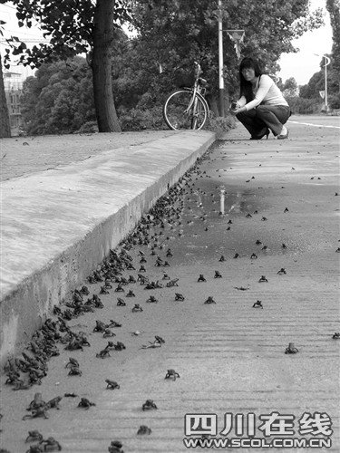 昨日,在豐樂水庫邊生活已30年的居民萬女士說,她發(fā)現(xiàn)有小蟾蜍從水庫里跳上岸是在一周前,當(dāng)時數(shù)量較少,很多人都沒留意。昨日一早,眼前景象讓她和鄰居們大吃一驚:原先“單兵”上岸的小蟾蜍此時已成“集團(tuán)軍”,公路上、道路邊、庫堤上、緊鄰水庫邊的居民樓房墻壁上,到處都爬滿了小蟾蜍,努力地朝同一個方向跳去。