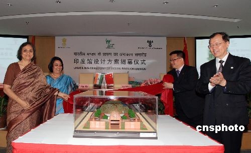 4月27日,上海世博會(huì)印度國(guó)家館設(shè)計(jì)方案在上海揭曉,印度政府總代表希拉女士(前左)與上海世博會(huì)中國(guó)政府總代表華君鐸(前右)等共同參加揭幕儀式。印度國(guó)家館以“城市與和諧”為主題,強(qiáng)調(diào)城鄉(xiāng)生活方式及文化的和諧。展館位于世博園區(qū)A區(qū),占地逾4000平方米,將展示印度豐富的文化傳統(tǒng)、多樣化的宗教信仰等。中新社發(fā) 潘索菲 攝