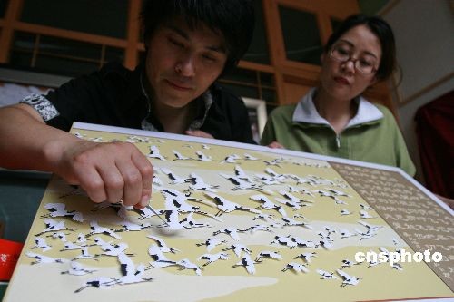 2009年5月7日,居住在北京東城區(qū)的姜文涵向人們展示剛剛完成的造型紙雕藝術(shù)——天堂之鳥千羽鶴。今年43歲的姜文涵來自黑龍江省海倫市。他從去年11月中旬開始,在妻子的協(xié)助下,用150多天的時(shí)間制作完成了999只丹頂鶴,分別鑲嵌在6個(gè)鏡框內(nèi),總長(zhǎng)度512厘米。姜文涵想把這套作品送給汶川相關(guān)部門,以此紀(jì)念在5·12汶川大地震中不幸罹難的同胞。中新社發(fā) 陳曉根 攝