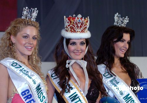 10月15日晚上,2007年國(guó)際小姐選美大賽決賽在日本東京舉行,六十一位佳麗參加角逐。經(jīng)過(guò)民族服裝、泳裝和晚禮服等項(xiàng)目激烈的競(jìng)爭(zhēng),最終2007年國(guó)際小姐由墨西哥小姐Priscilla Perales獲得,亞軍由希臘小姐Despoina Vlepaki獲得,而季軍則由白俄羅斯小姐Yuliya Iindzeyeva摘取。來(lái)自中國(guó)香港的香港小姐王君馨獲得2007國(guó)際友誼小姐的獎(jiǎng)項(xiàng)。中新社發(fā) 滕劍峰 攝