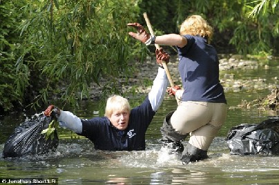 約翰遜當(dāng)時(shí)正在和志愿者們一同為倫敦東南部的普利河清除垃圾,穿著防水長靴、戴著橡膠手套的他在靠近岸邊的淺水區(qū)忙得不亦樂乎。在攝像機(jī)面前擺出各種姿勢后,約翰遜突然被一個(gè)水洼絆倒,并跌倒在河水中。3名志愿者見勢沖了過去,用一根竹竿奮力將他拖出水面。