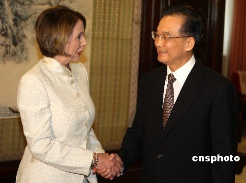 5月27日下午,中國(guó)國(guó)務(wù)院總理溫家寶在北京中南海紫光閣會(huì)見(jiàn)來(lái)華訪問(wèn)的美國(guó)國(guó)會(huì)眾議院議長(zhǎng)南!づ迓逦鳌D舷!づ迓逦鲬(yīng)中國(guó)全國(guó)人大常委會(huì)委員長(zhǎng)吳邦國(guó)的邀請(qǐng),從5月24日至5月30日在中國(guó)訪問(wèn)。中新社發(fā) 任晨鳴 攝